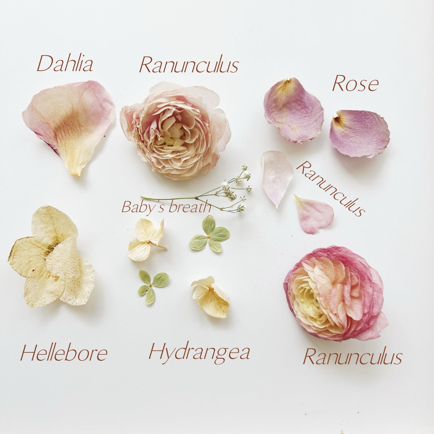 Here are some examples of how different flowers look after they have been Dried in Silica Gel. Feel free to send us a message when choosing the flowers for your bouquet and our experts will be happy to guide you through the best options to press!