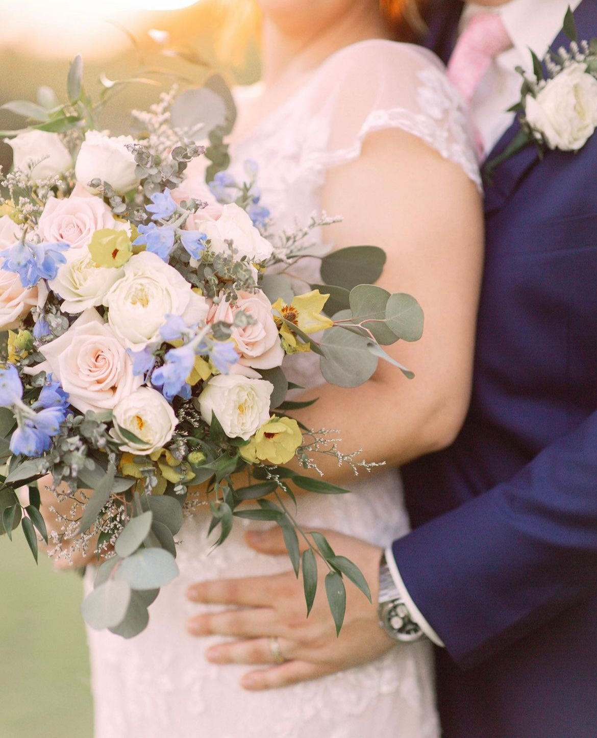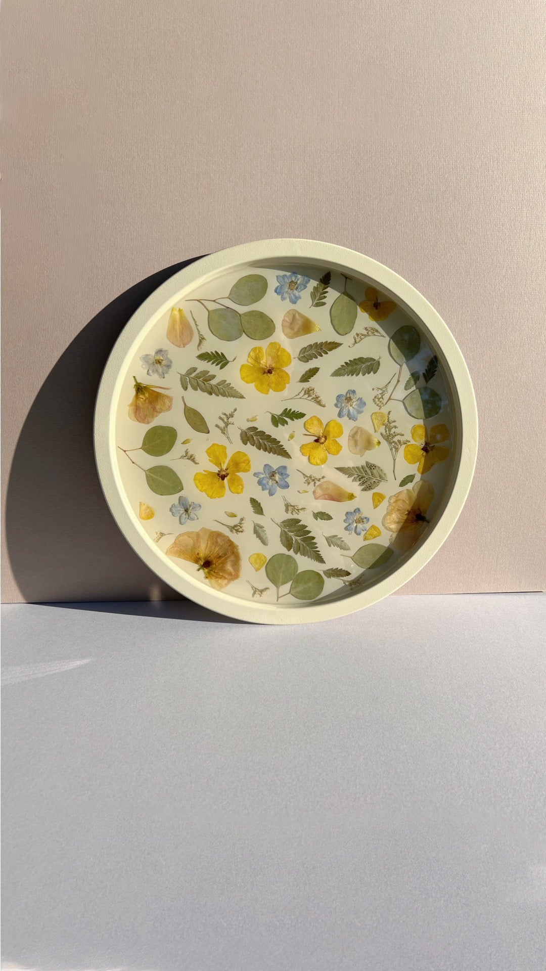 This Bride's exquisite bouquet had a mix of white and pink Roses, yellow Poppies, light blue Delphinium, white Limonium, Eucalyptus, and Ferns. These beautiful flowers were Naturally Pressed and enshrined in a Resin Table Tray.