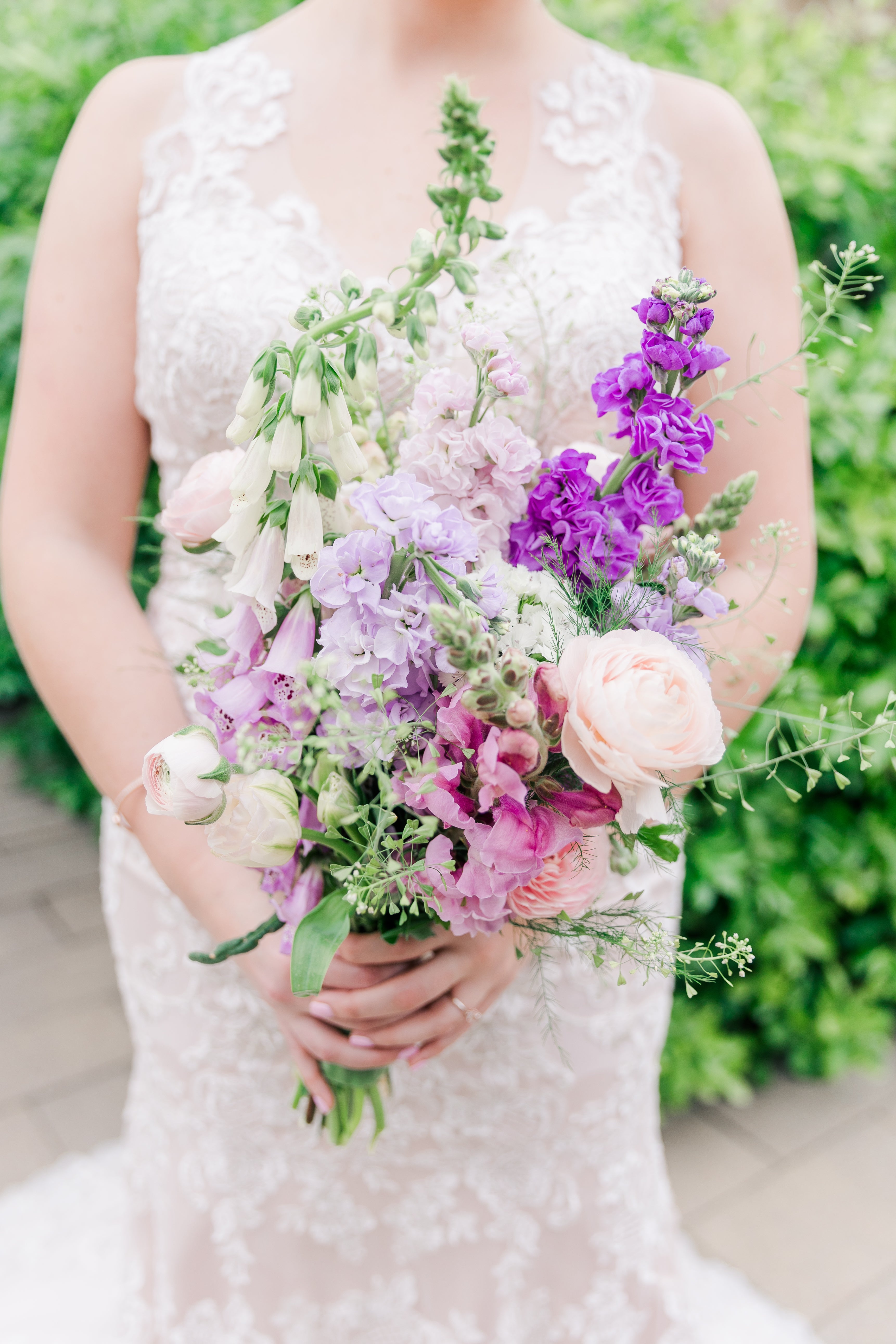 This beautiful Bride's bouquet had a mix of purple and pink Stock Flowers, Beardtongue Flowers, and Ranunculus, as well as soft and delicate greenery that we Naturally Pressed and displayed in a Resin Tray.