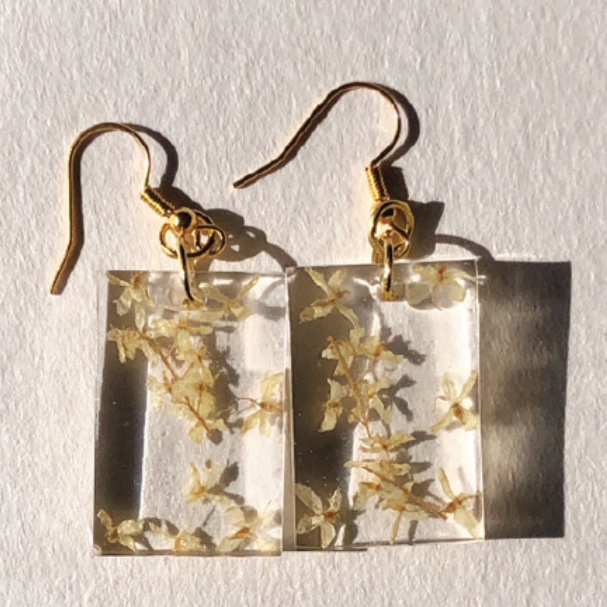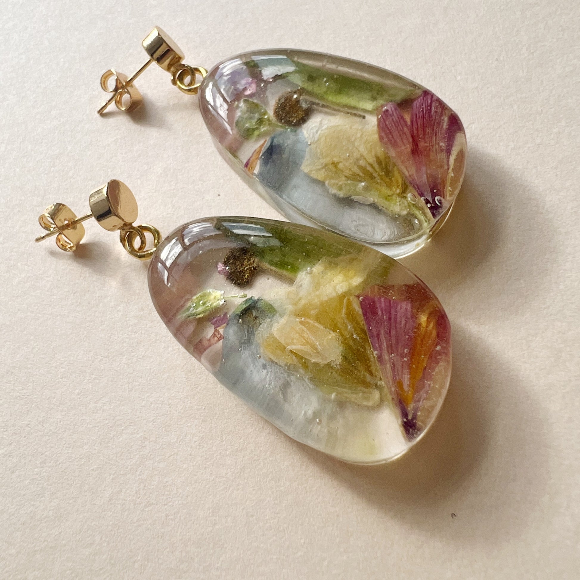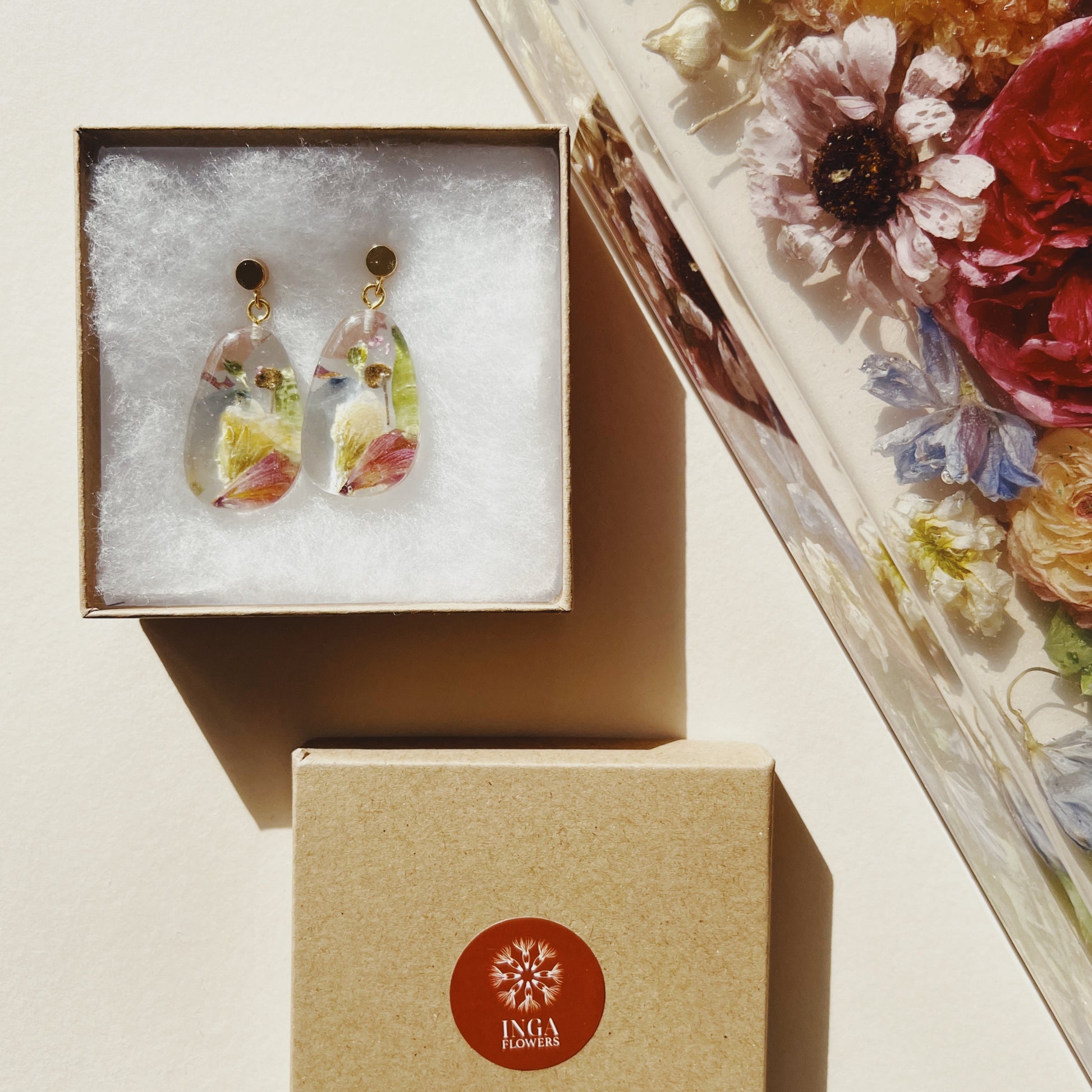 After your wedding, you can send us a few petals or small blooms specifically for the earrings, or we can use leftover flowers from your larger preservation pieces (like frames or trays). During the design phase, you’ll choose your preferred resin shape (teardrop, circle, bar, etc.) and post material.