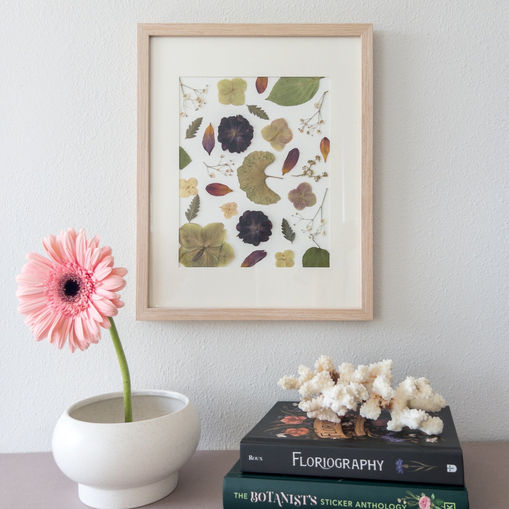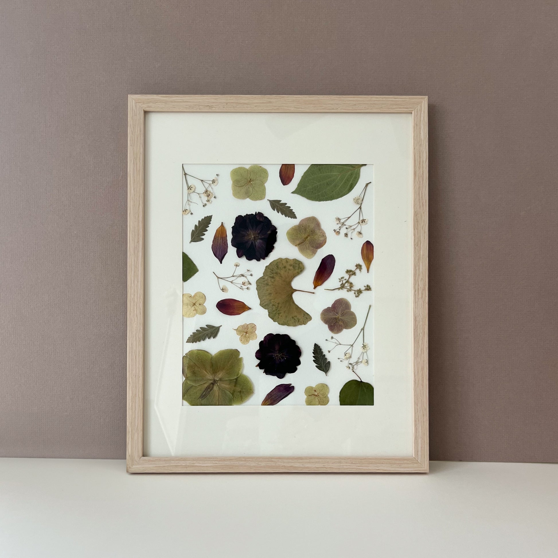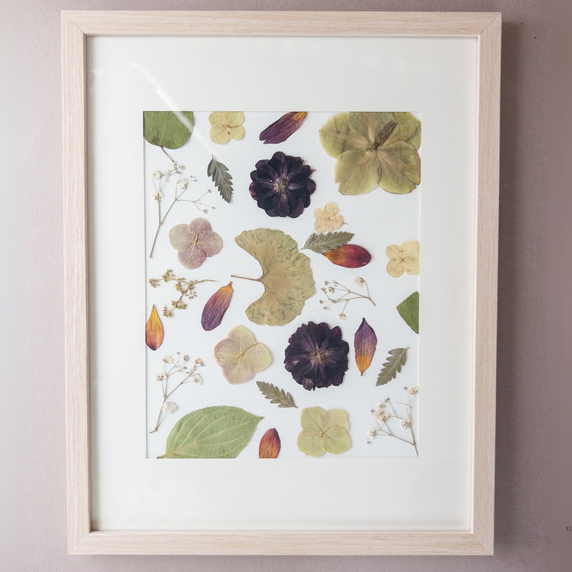 At the center of the composition lies a Ginkgo leaf, an ancient symbol of longevity and memory, reminding us that we are never alone on our path. Surrounding it, purple ranunculus from Ecuador speaks of depth and intuition, while soft dahlia petals and hydrangeas, gathered from my neighborhood in Ardmore, echo the emotional richness of those who came before us. Helleborus, lovingly grown on my balcony, adds a gentle strength, blooming even in the coldest seasons. Baby’s breath brings a breath of grace and continuity, while ferns ground the piece, connecting past to present with their quiet, steady presence. Pressed with care and deep reverence, this frame holds more than floral beauty—it holds lineage. Let it be a sacred reminder that you are held, guided, and strengthened by those who walked before you.