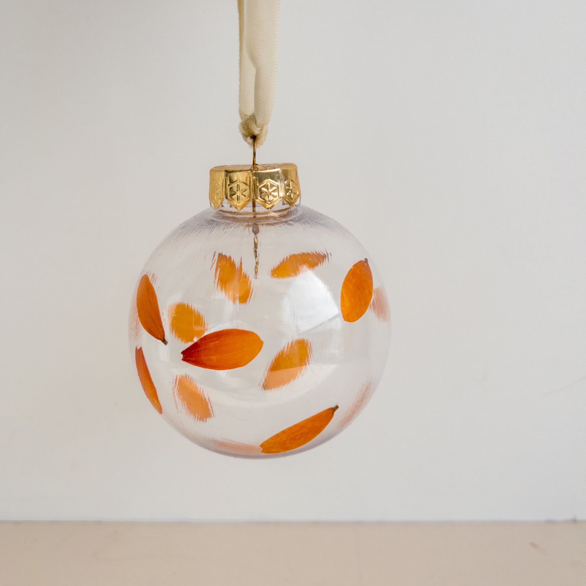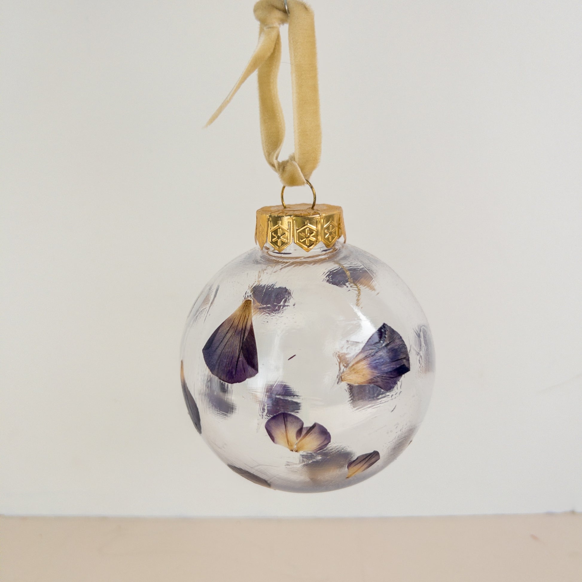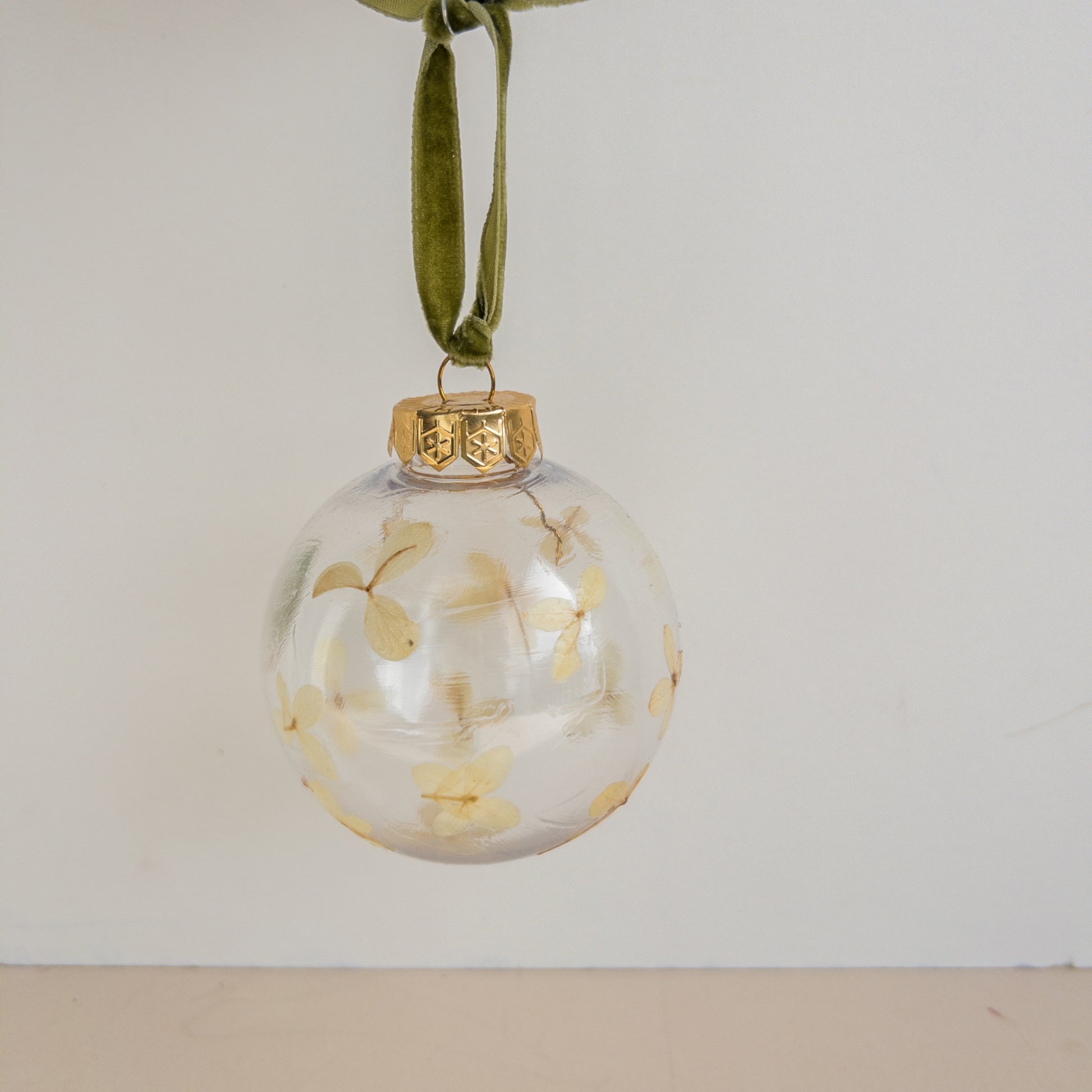 Every piece is one-of-a-kind, featuring its own unique floral arrangement. Hung by a soft velvet ribbon and topped with a gold cap, it adds an elegant touch to any tree, wreath, or festive styling.